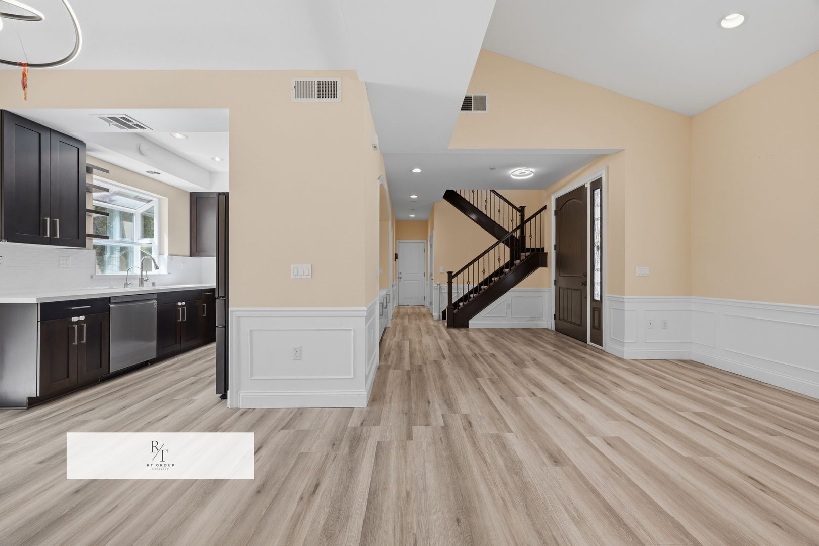 The modern kitchen features quartz countertops and deluxe cabinetry, perfect for both casual meals and entertaining. The 2-car garage with coated surfaces and EV charger, plus an additional outdoor parking space, provides ample convenience.