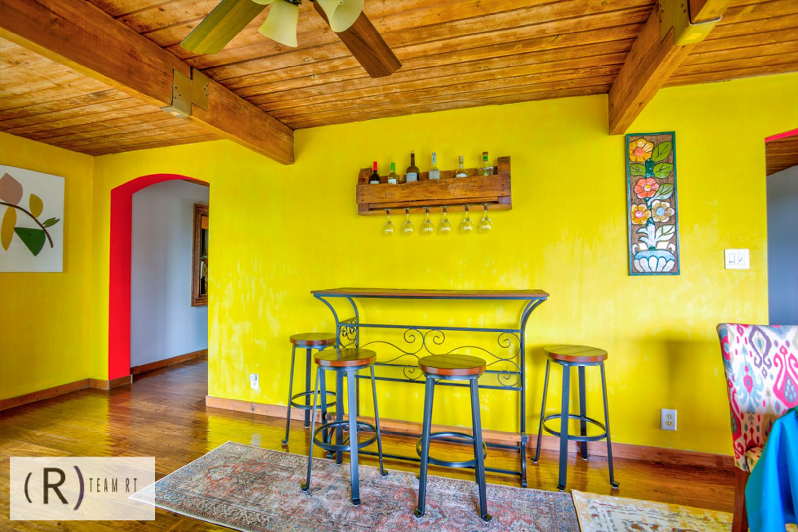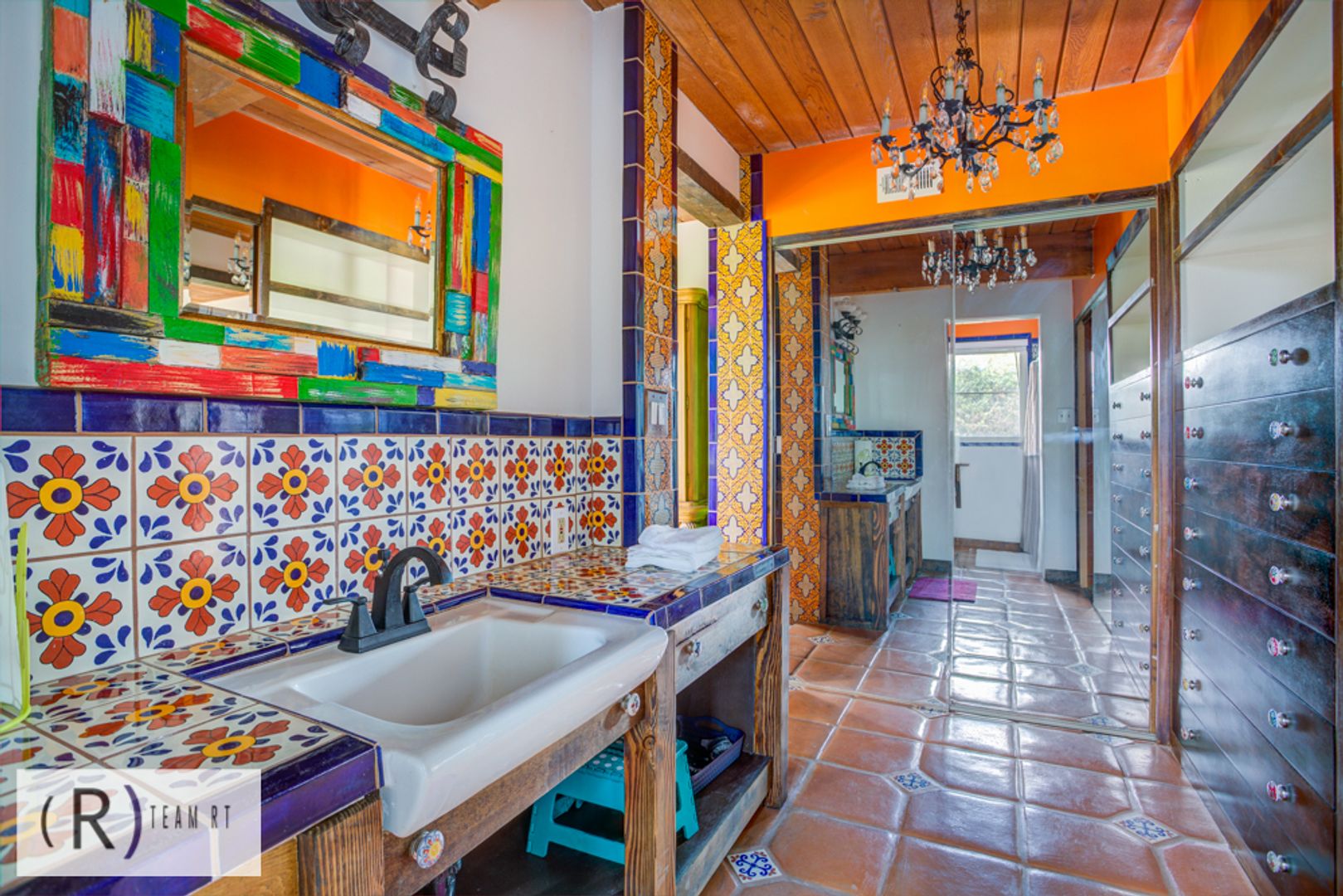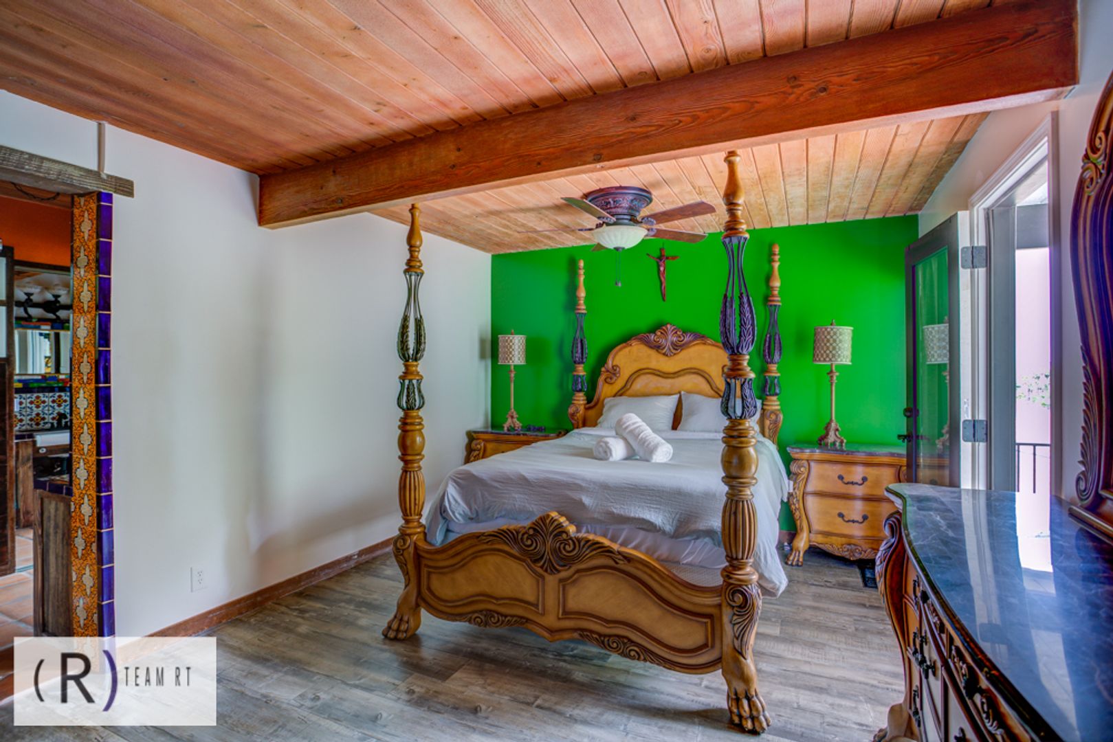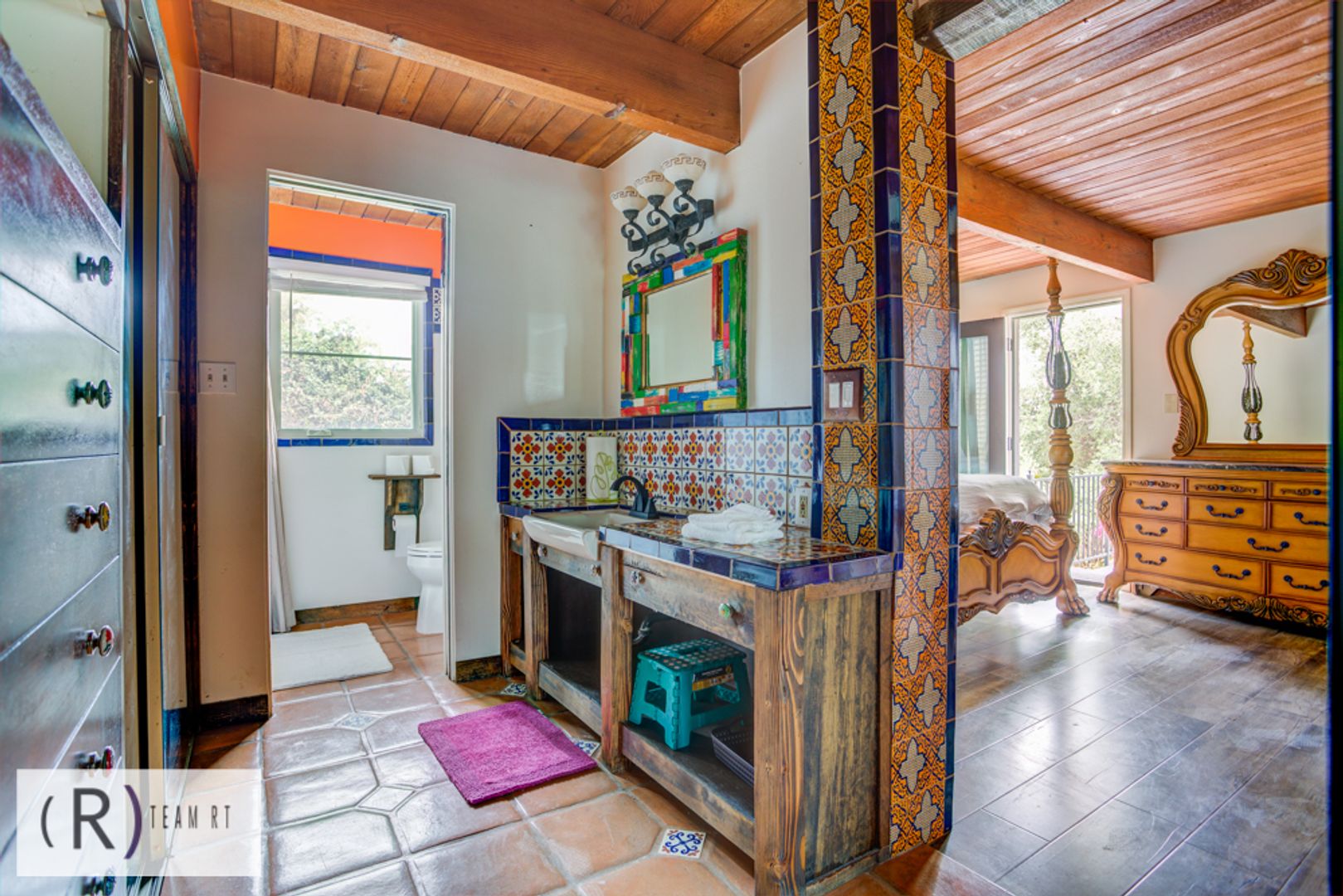 On the same level as the kitchen, you will find the 4 bedrooms and 2 full bathrooms. Each bedroom is beautifully arranged with mid-century modern with a Spanish influence vibrant colored bed, accentuated with ceiling fans, built-in cabinets, and wide window glass.