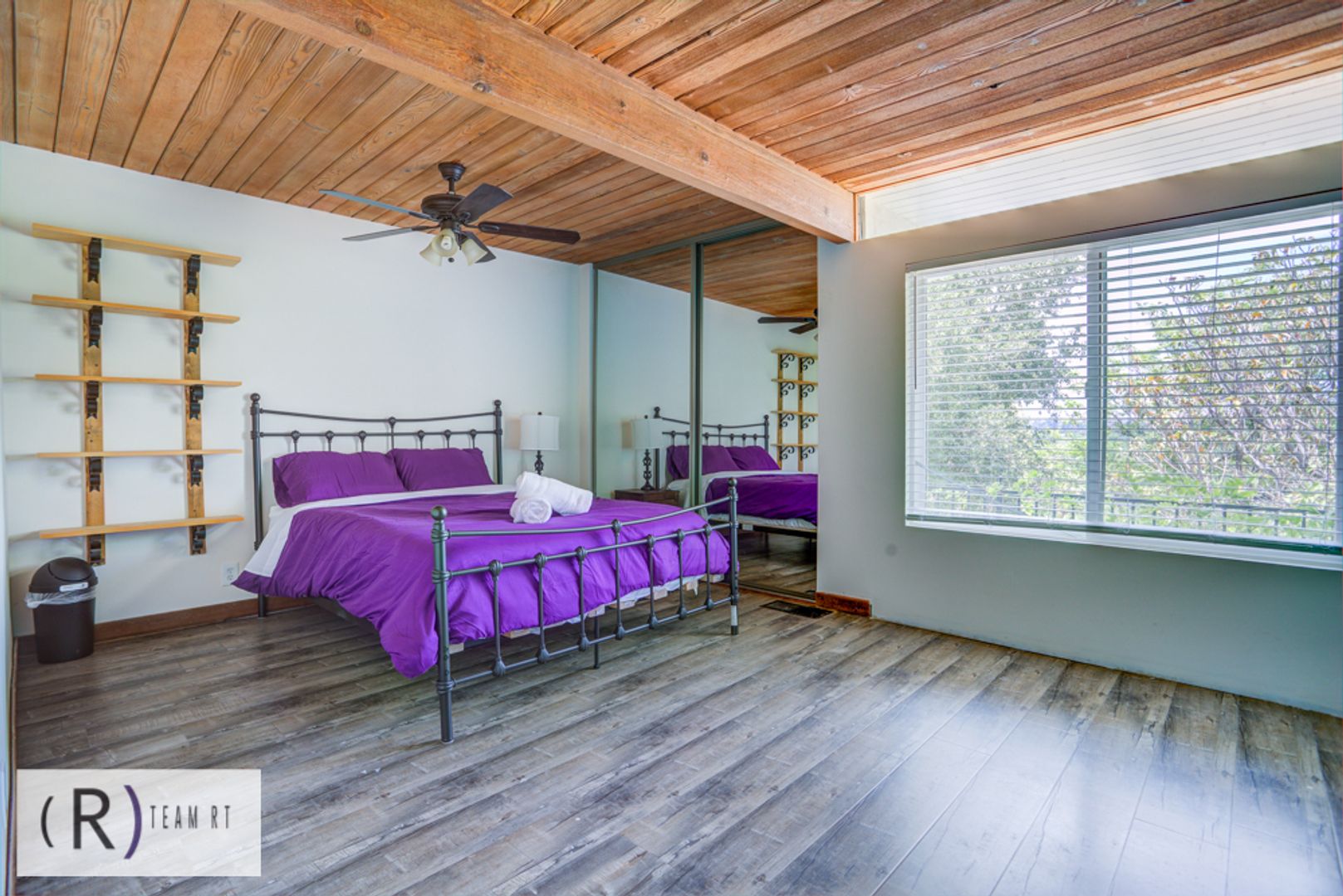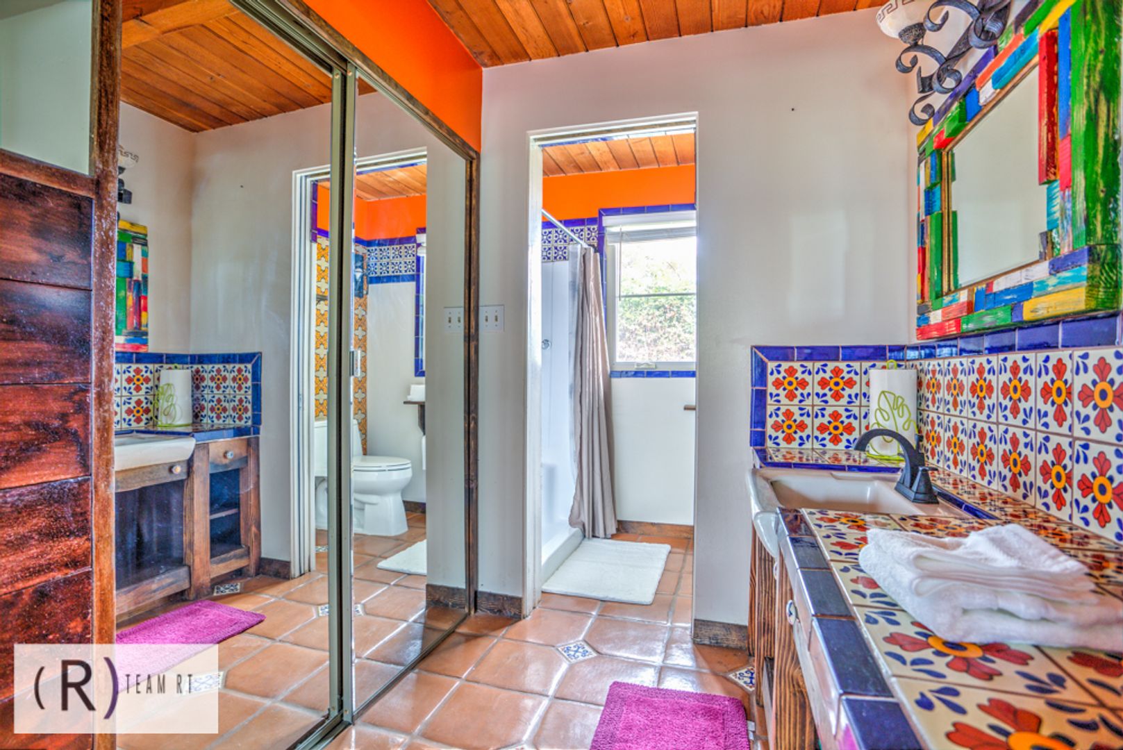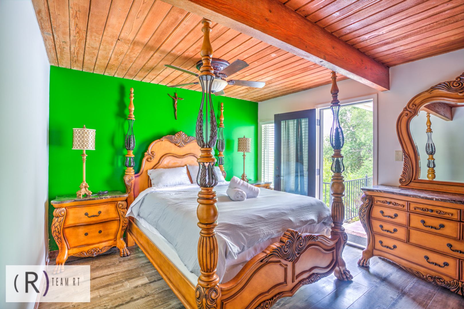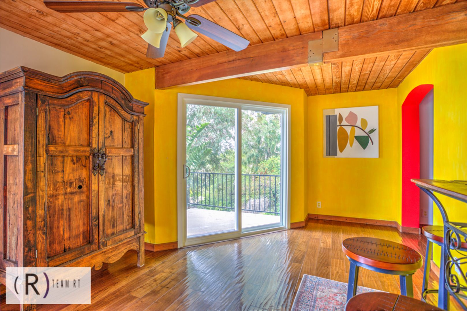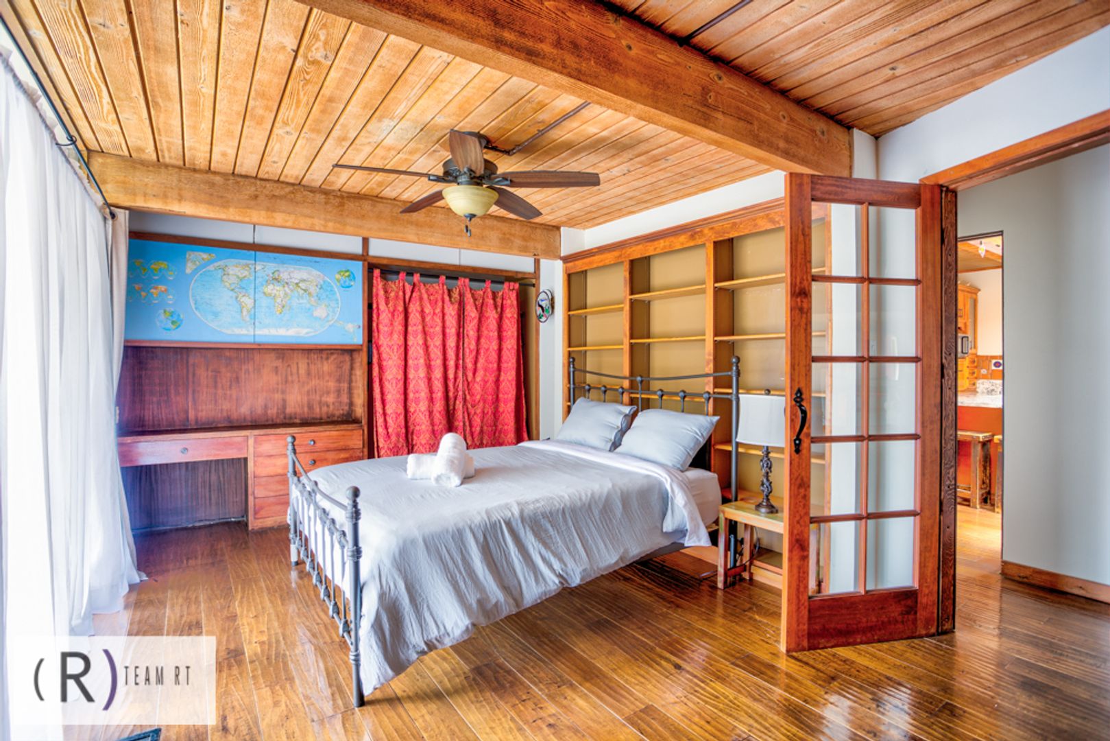 On the same level as the kitchen, you will find the 4 bedrooms and 2 full bathrooms. Each bedroom is beautifully arranged with mid-century modern with a Spanish influence vibrant colored bed, accentuated with ceiling fans, built-in cabinets, and wide window glass.