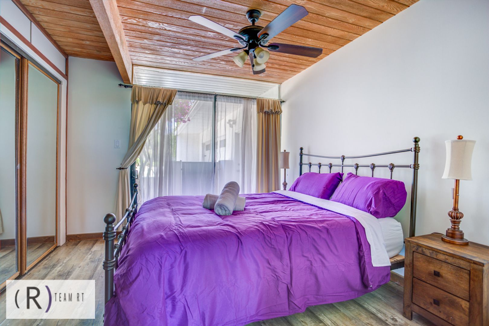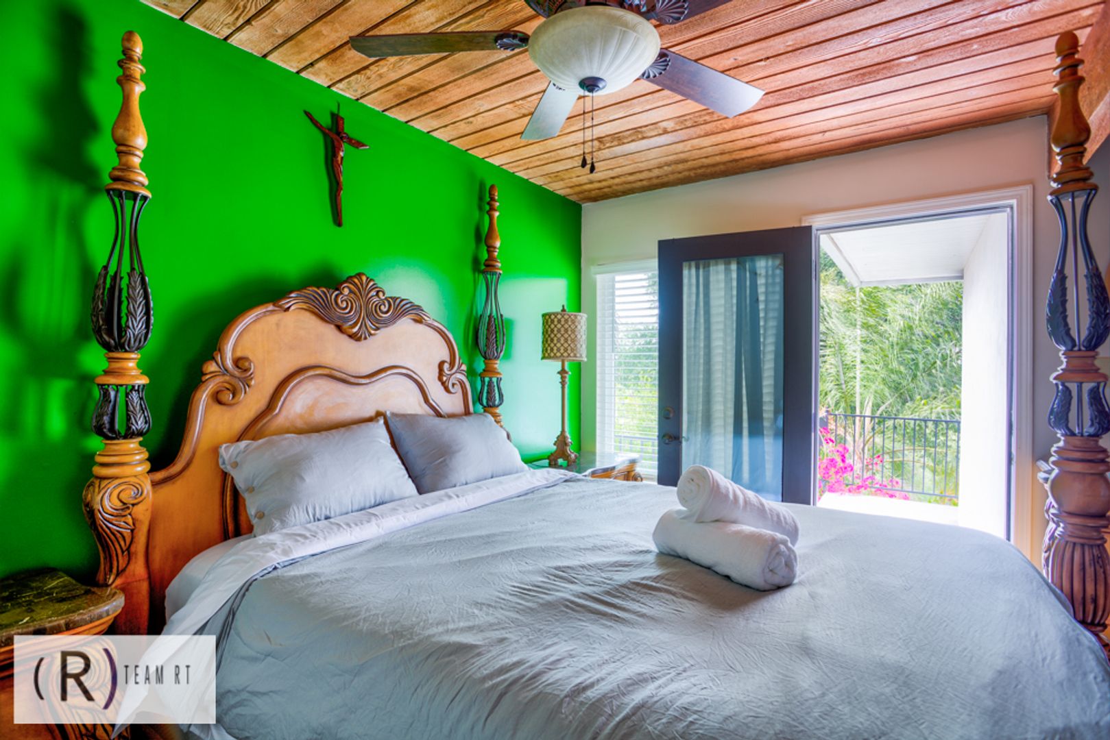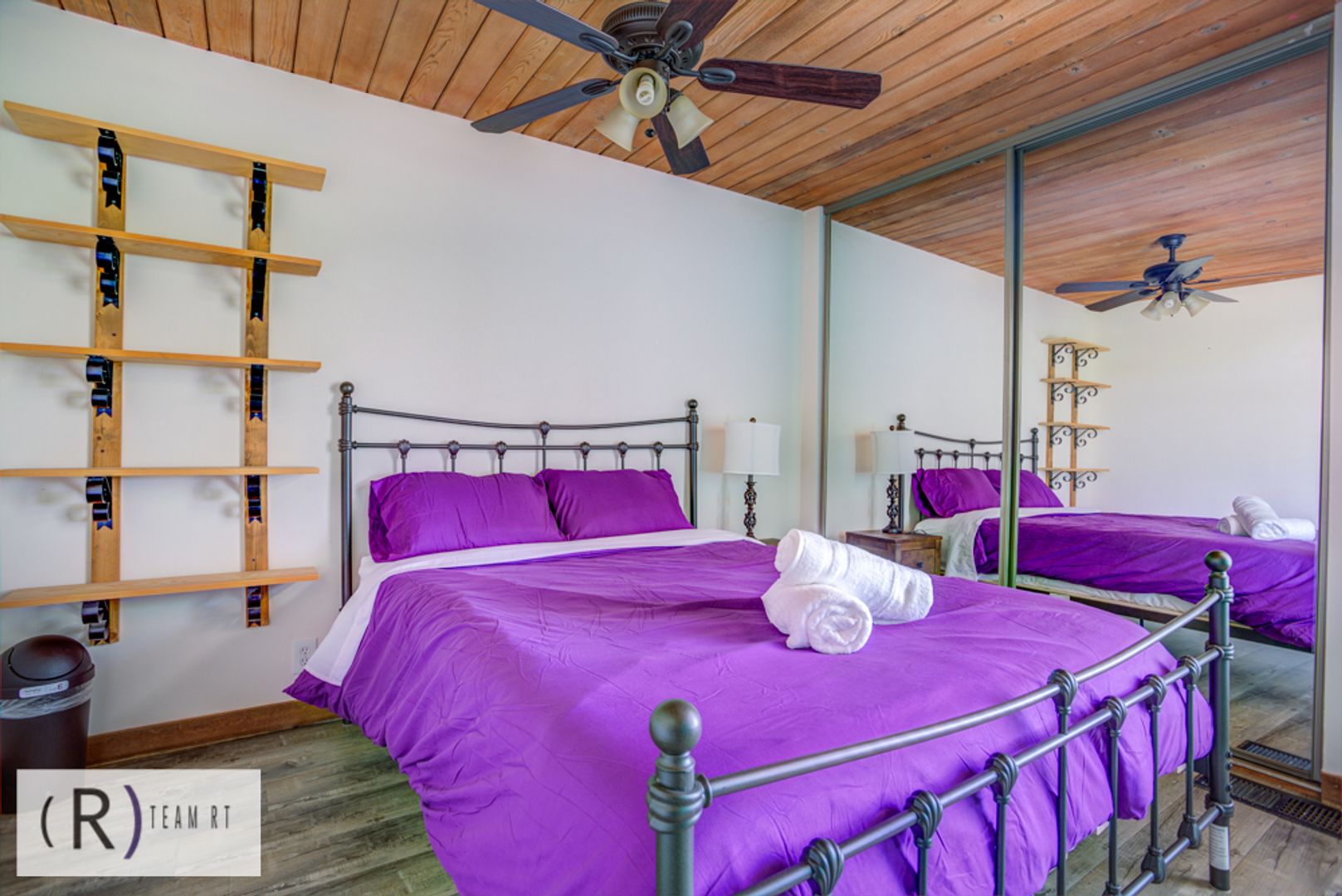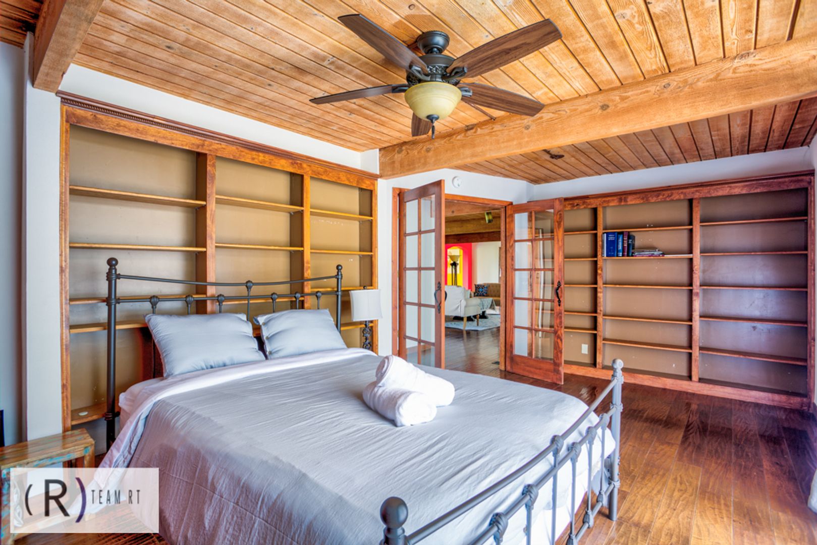 On the same level as the kitchen, you will find the 4 bedrooms and 2 full bathrooms. Each bedroom is beautifully arranged with mid-century modern with a Spanish influence vibrant colored bed, accentuated with ceiling fans, built-in cabinets, and wide window glass.