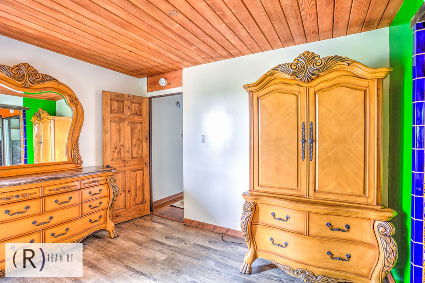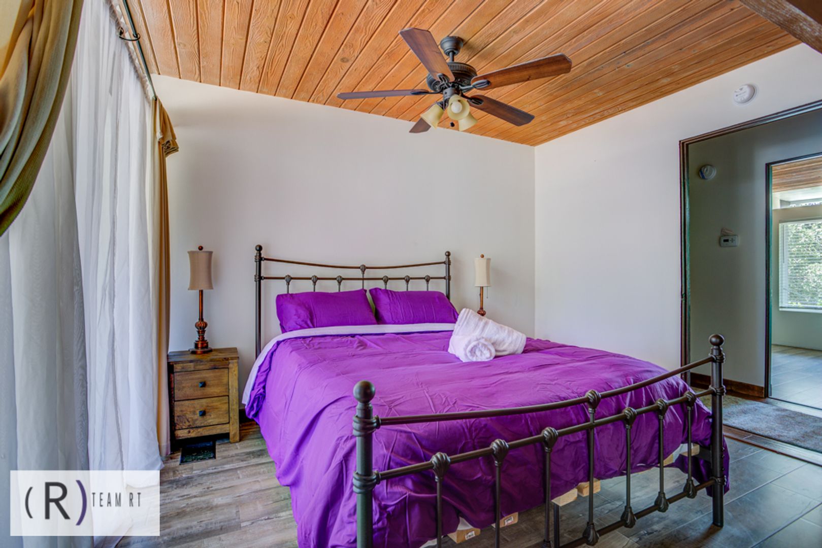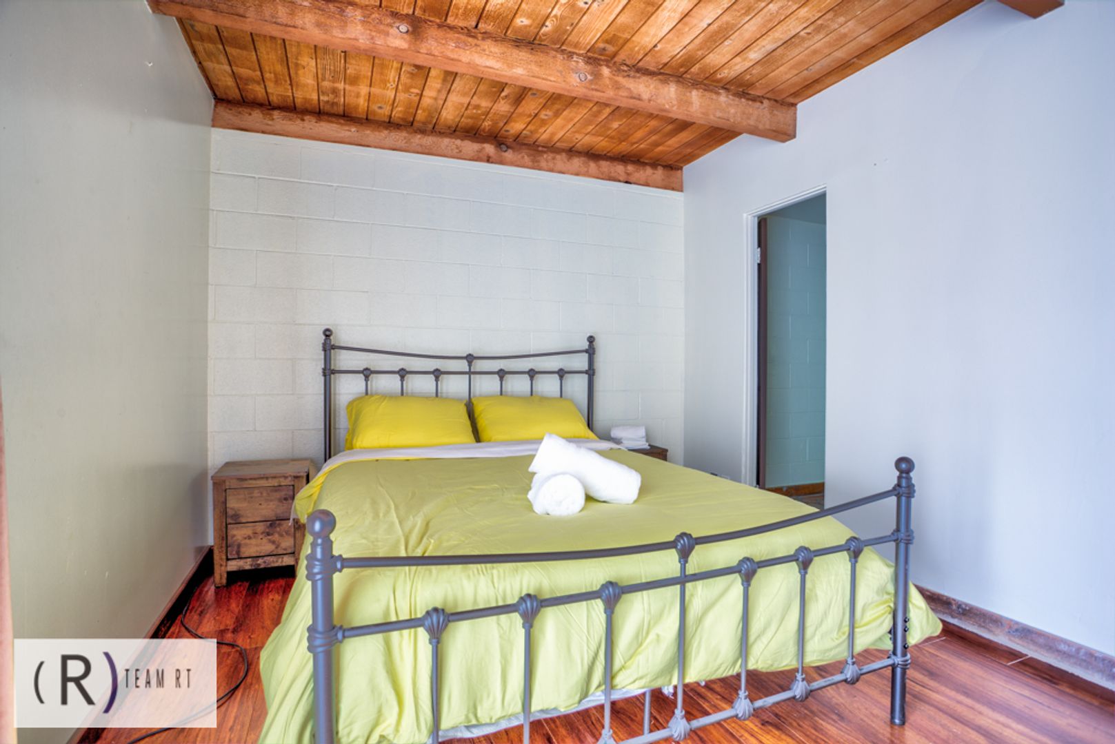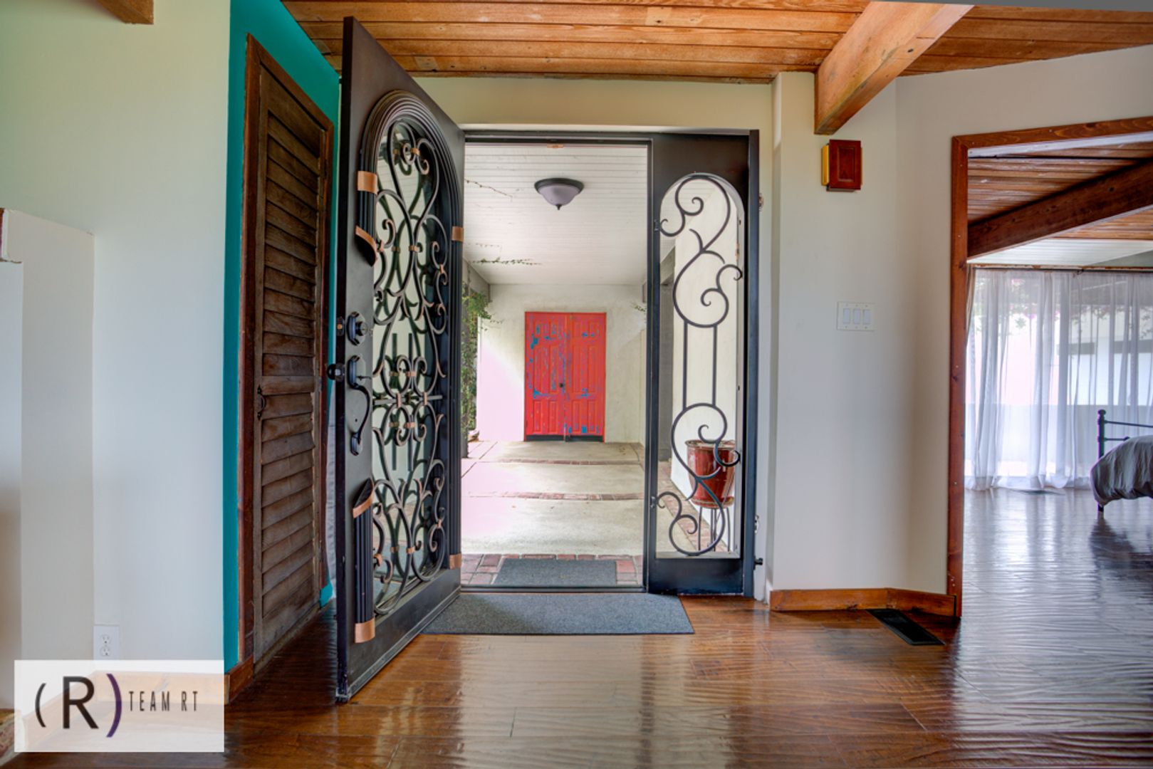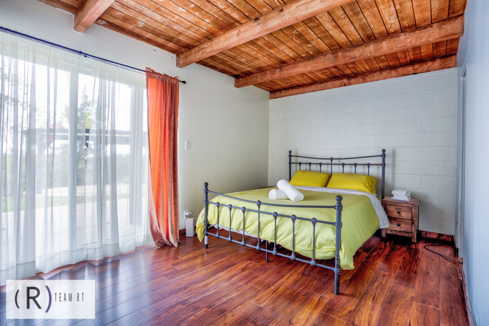 On the same level as the kitchen, you will find the 4 bedrooms and 2 full bathrooms. Each bedroom is beautifully arranged with mid-century modern with a Spanish influence vibrant colored bed, accentuated with ceiling fans, built-in cabinets, and wide window glass.