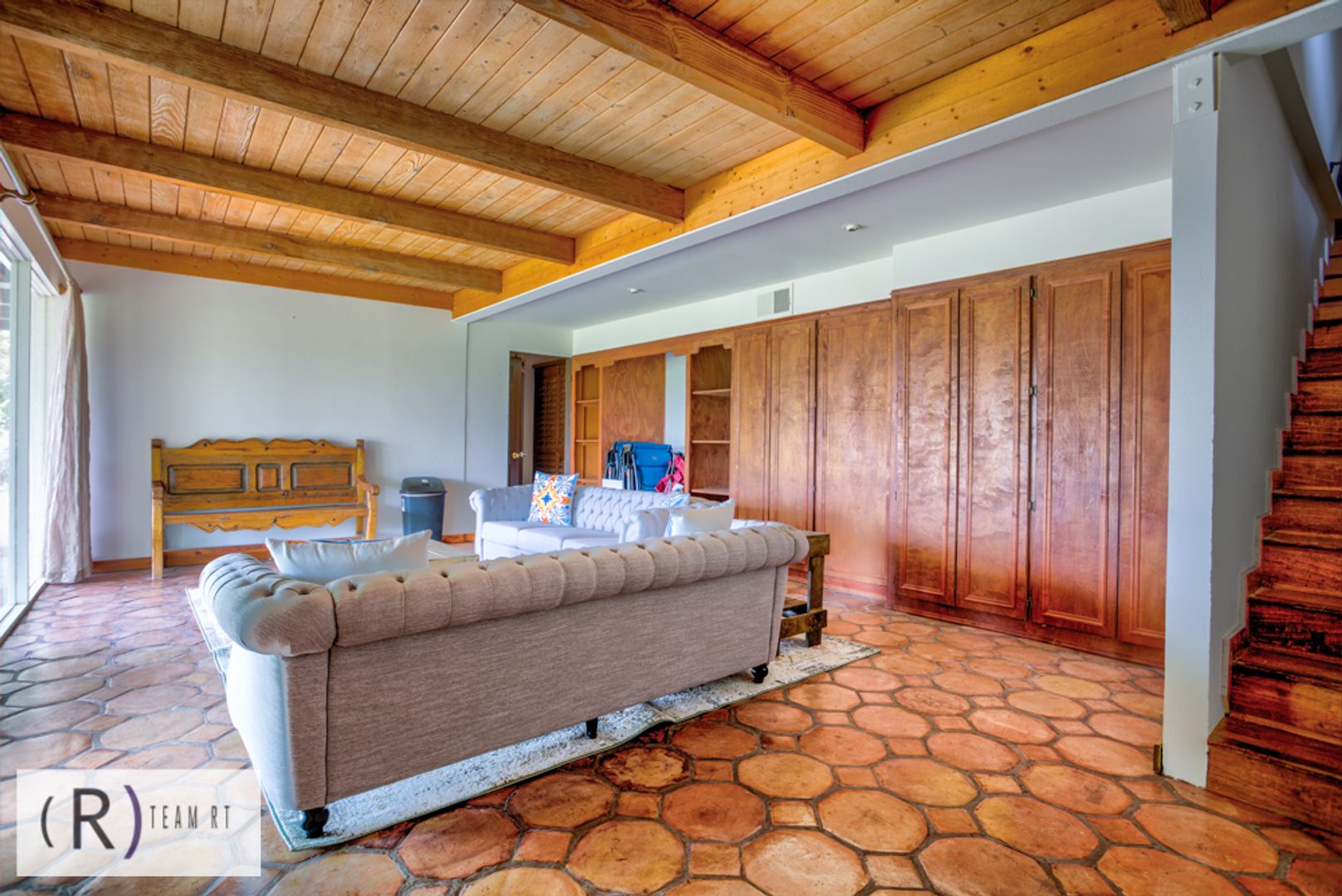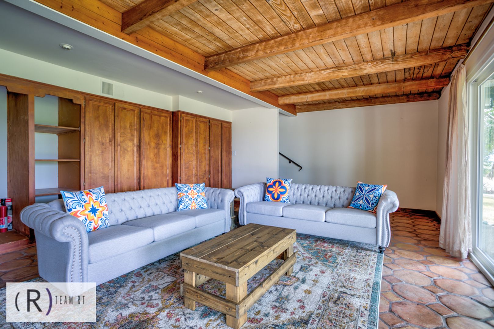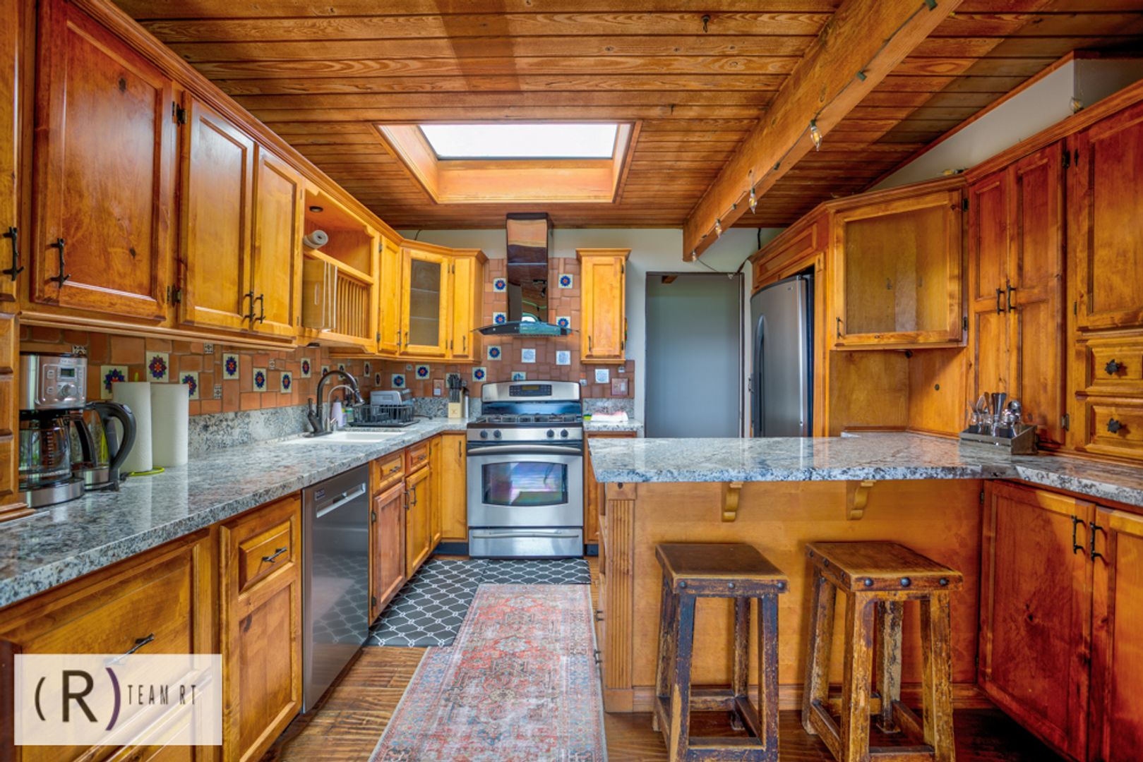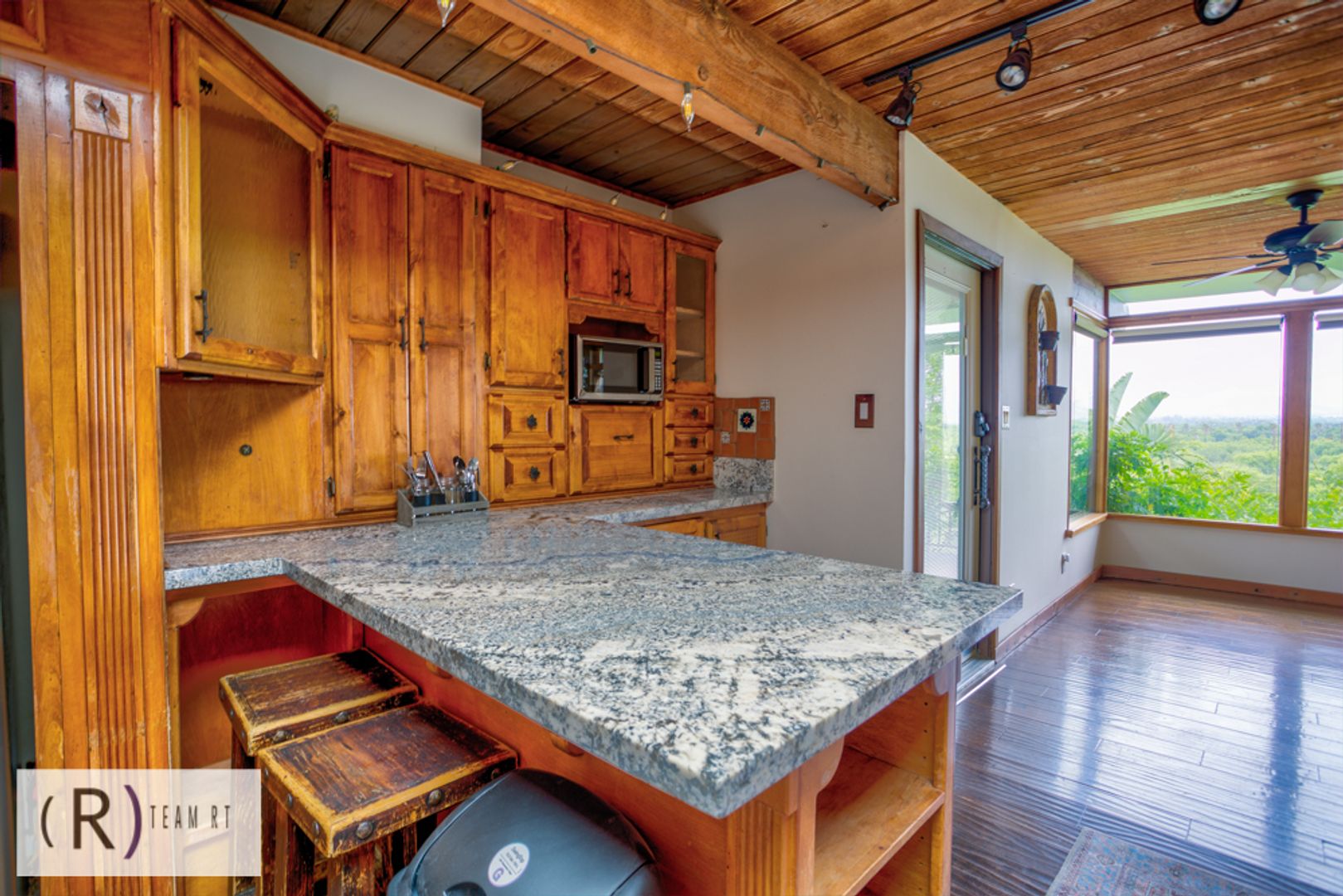 The kitchen has granite countertops, stainless steel appliances, custom lighting and distressed cabinets with ample cabinetry. Another open space has Saltillo tile, wooden beams, and shelving that could be used as a game room or an all-purpose family room