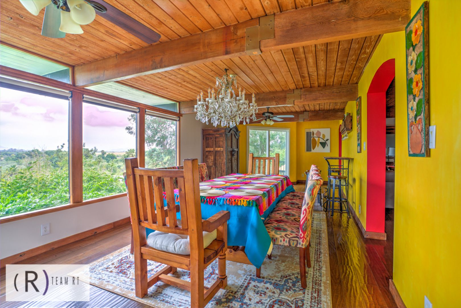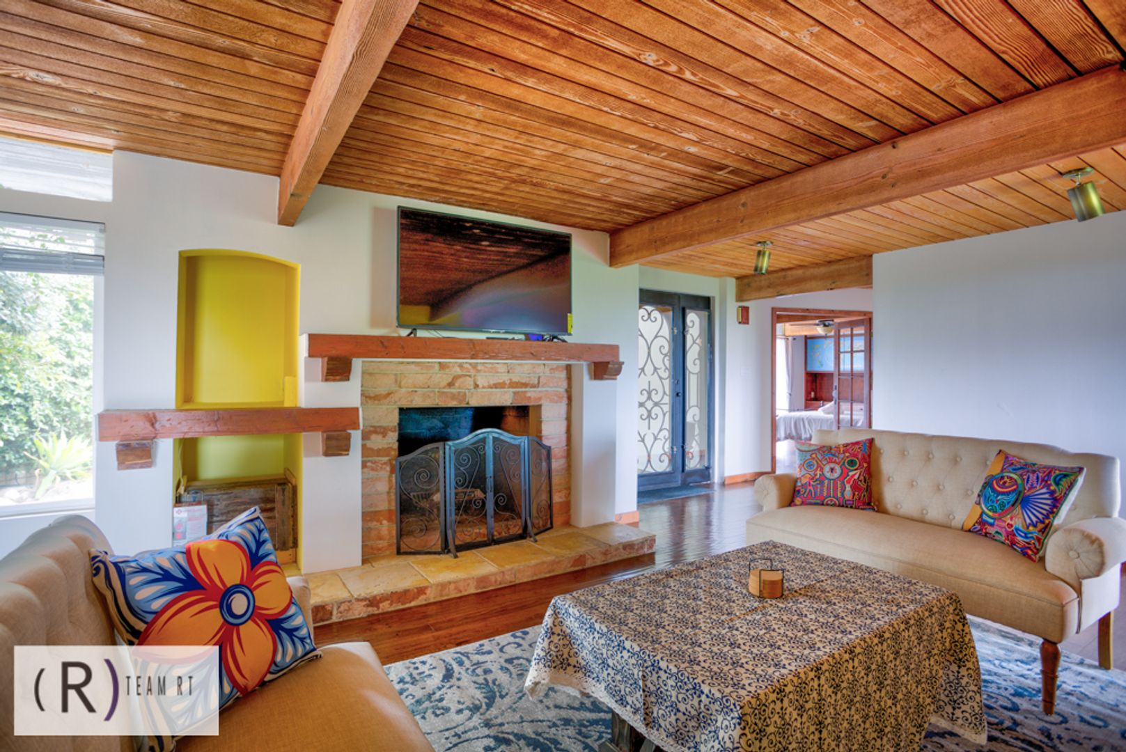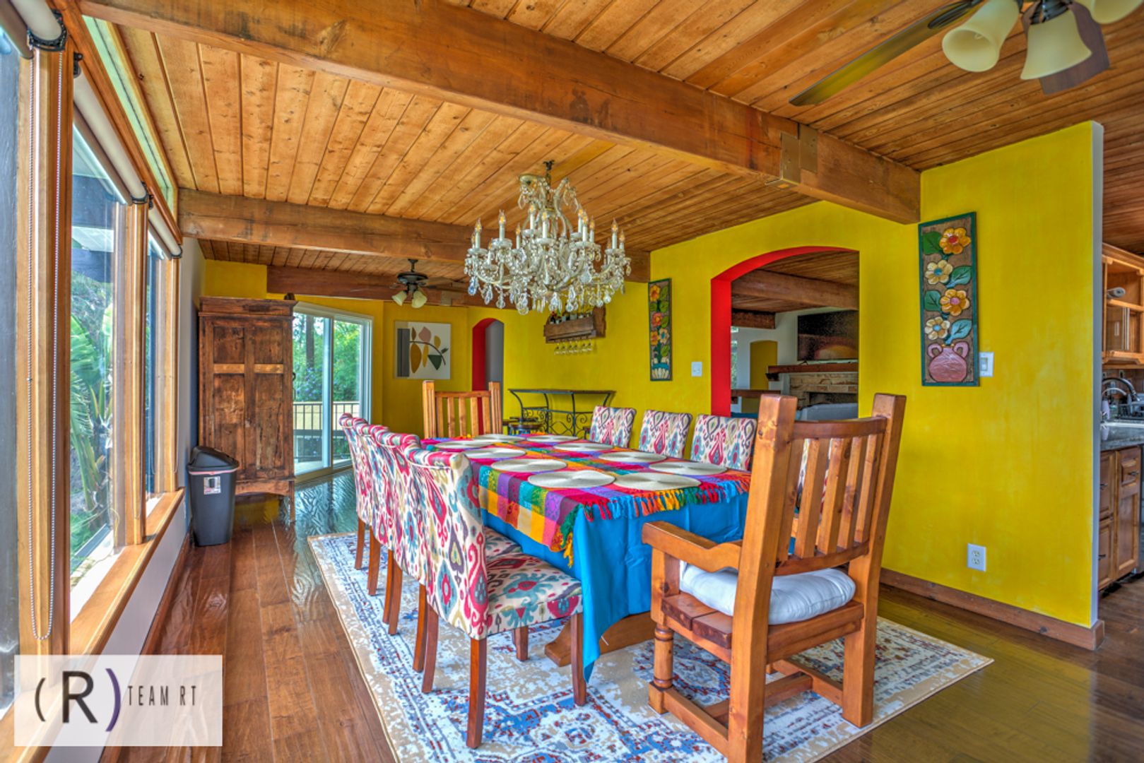 As you step inside, you'll be captivated by the rich colors of the living room and tiled fireplace, adding warmth and charm to the living space. The Spanish influence is evident throughout, with wooden beams and brightly colored walls that beautifully highlight the colored Spanish tiles placed throughout the home. The wood laminate flooring adds a touch of elegance and is easy to maintain.