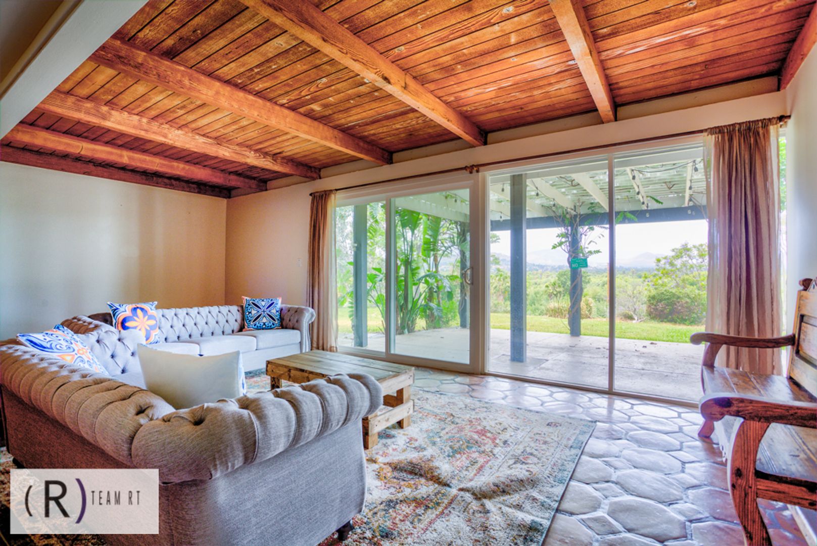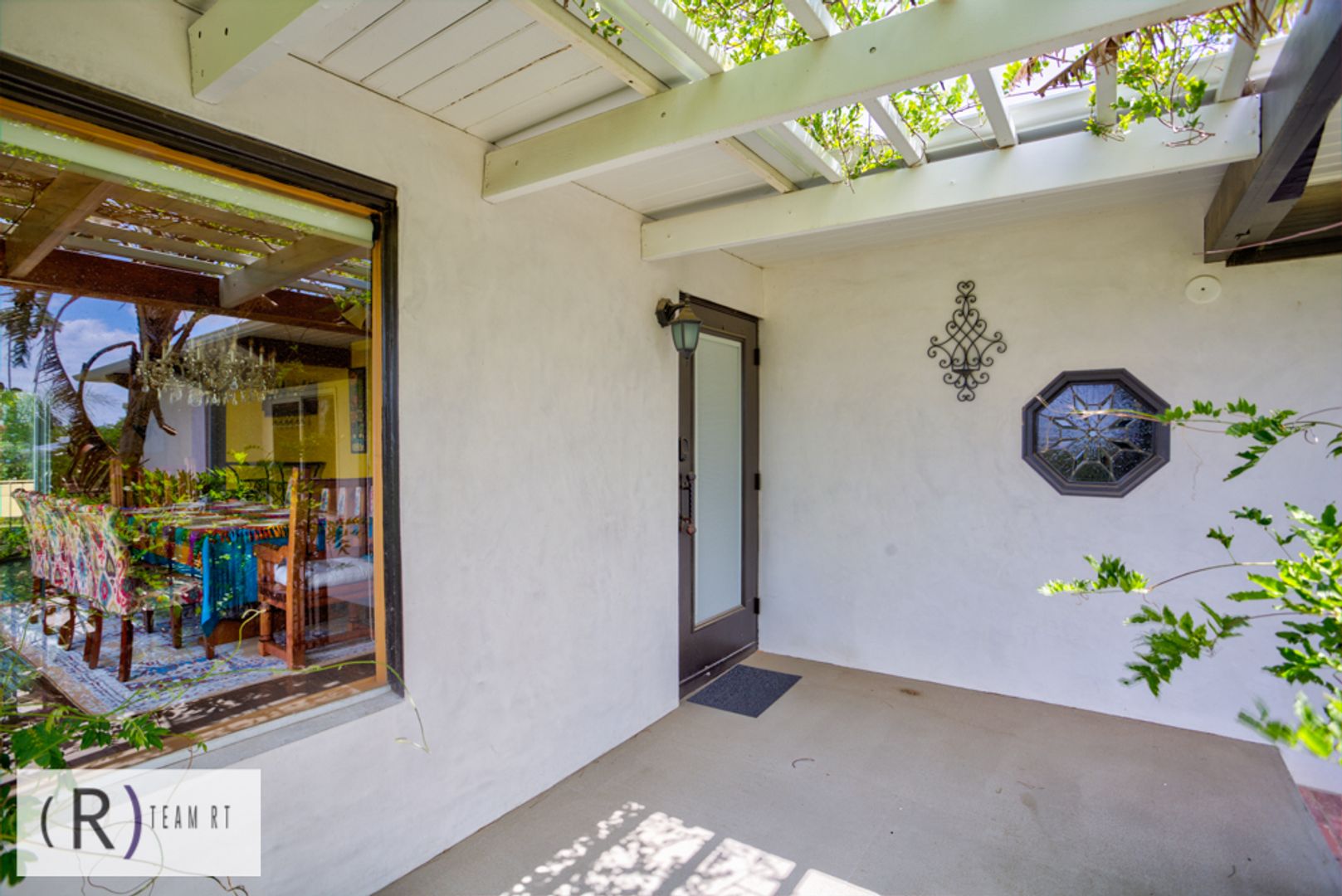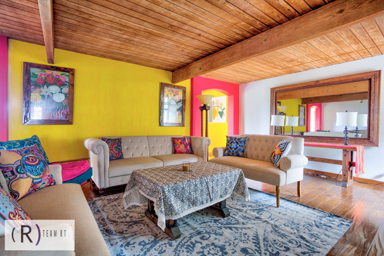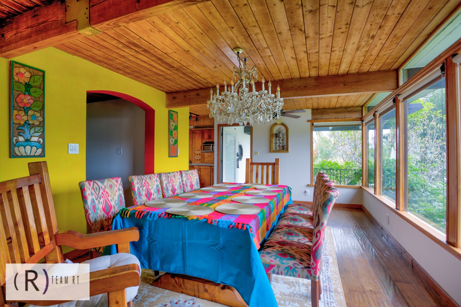 As you step inside, you'll be captivated by the rich colors of the living room and tiled fireplace, adding warmth and charm to the living space. The Spanish influence is evident throughout, with wooden beams and brightly colored walls that beautifully highlight the colored Spanish tiles placed throughout the home. The wood laminate flooring adds a touch of elegance and is easy to maintain.