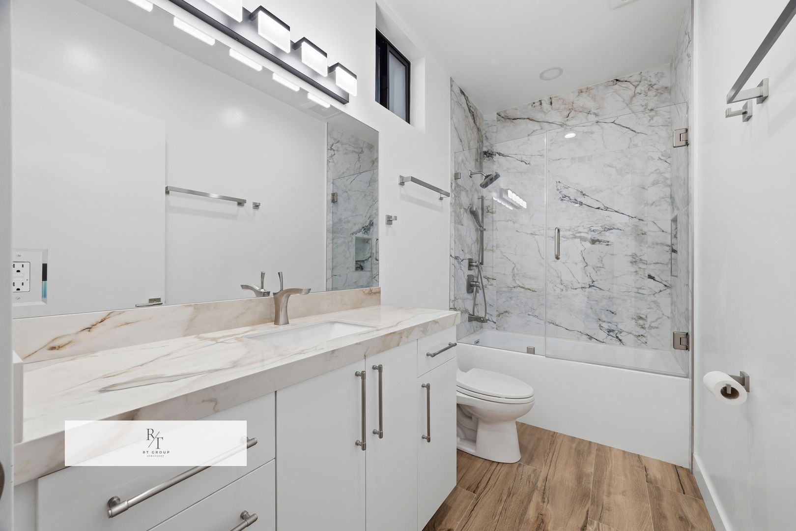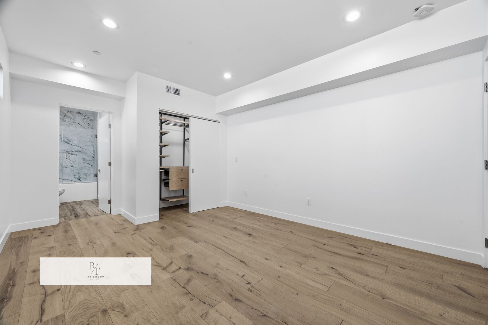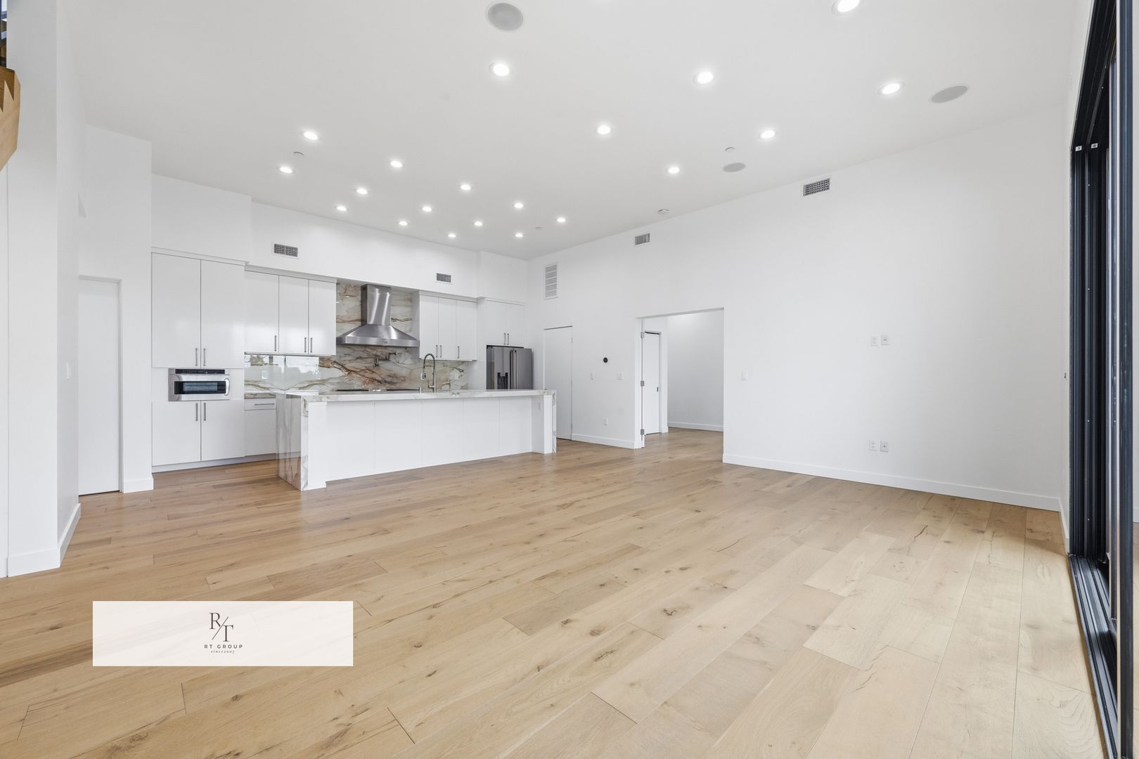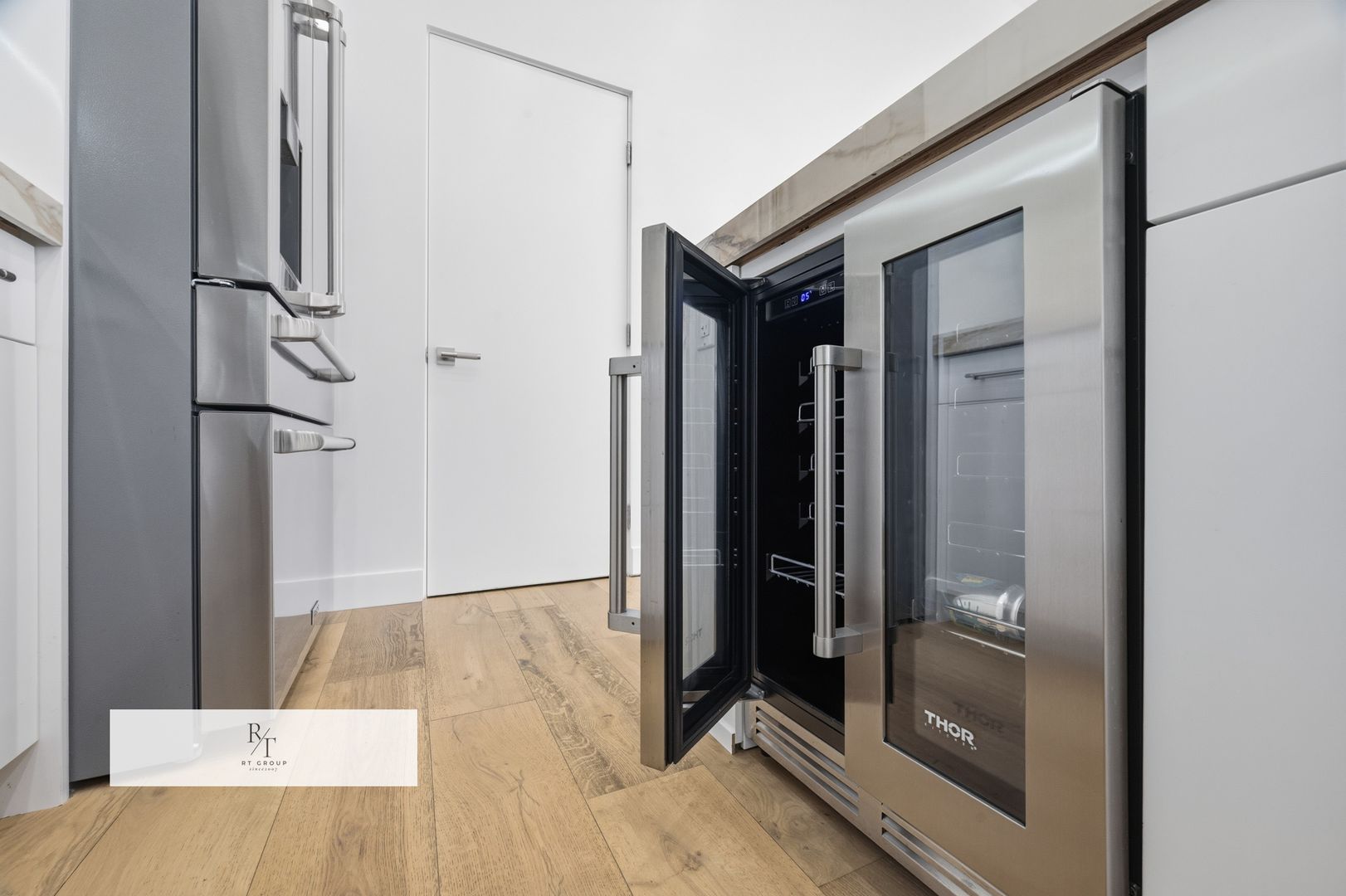 The designer kitchen is a true showpiece, featuring sleek Calacatta porcelain countertops, a striking bookmatched Calacatta porcelain backsplash, premium brand-new stainless steel Thor appliances, a built-in wine refrigerator, and an oversized center island ideal for both everyday living and sophisticated entertaining