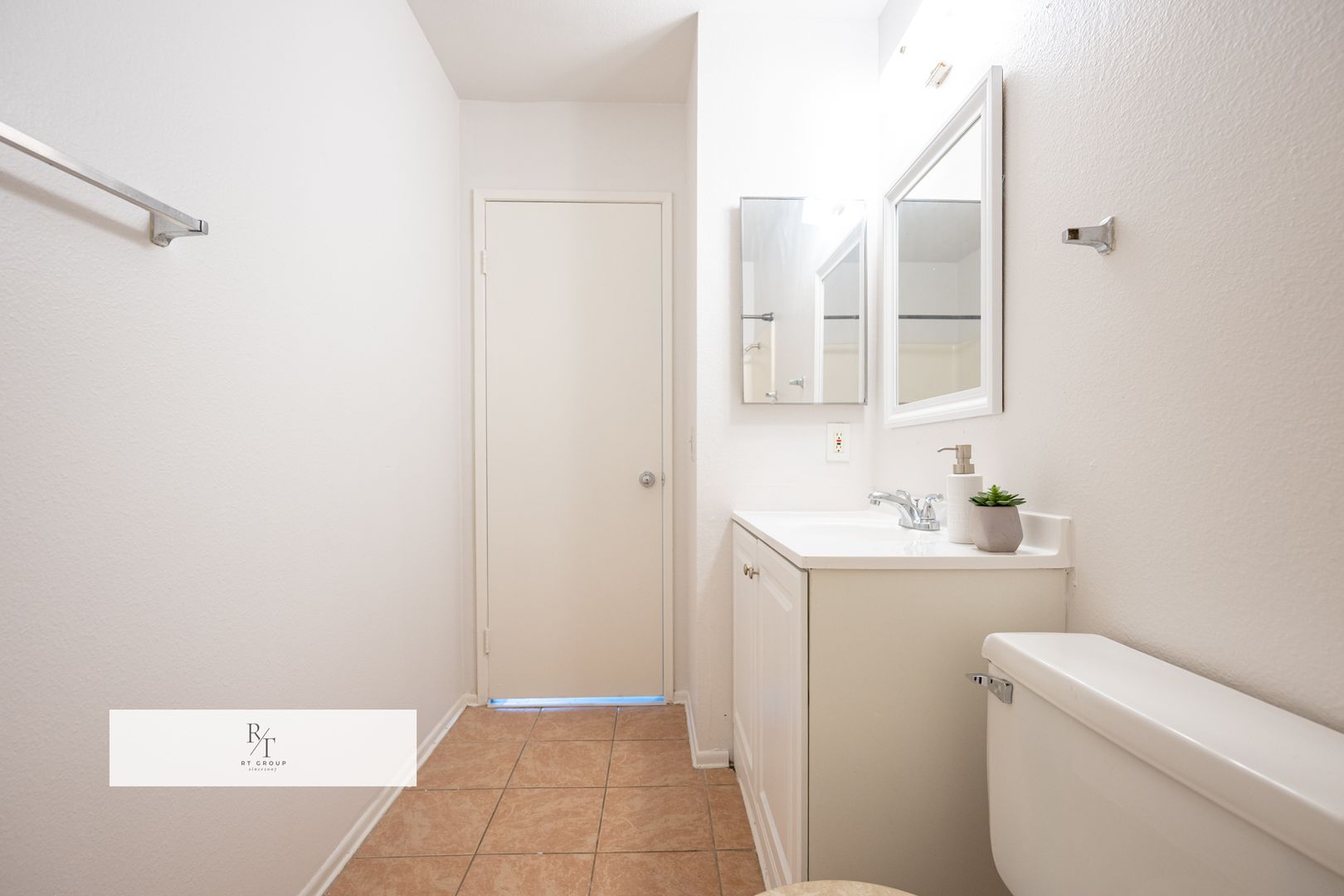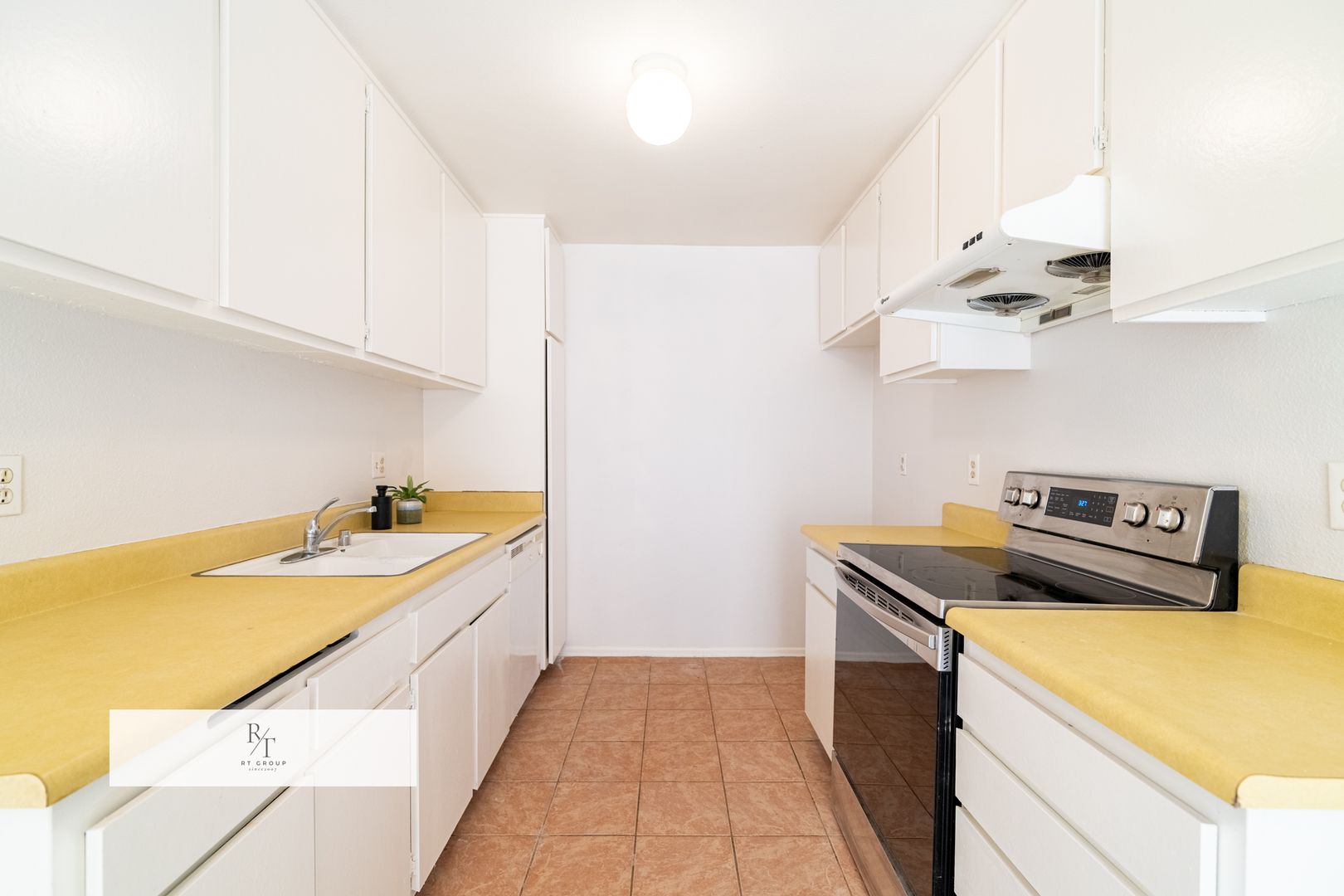 Back inside, the kitchen features a stainless steel range and plenty of cabinet space. The floorplan includes a guest room, a full bathroom and bonus hallway storage, in addition to the primary bedroom with two closets & a private ensuite.
