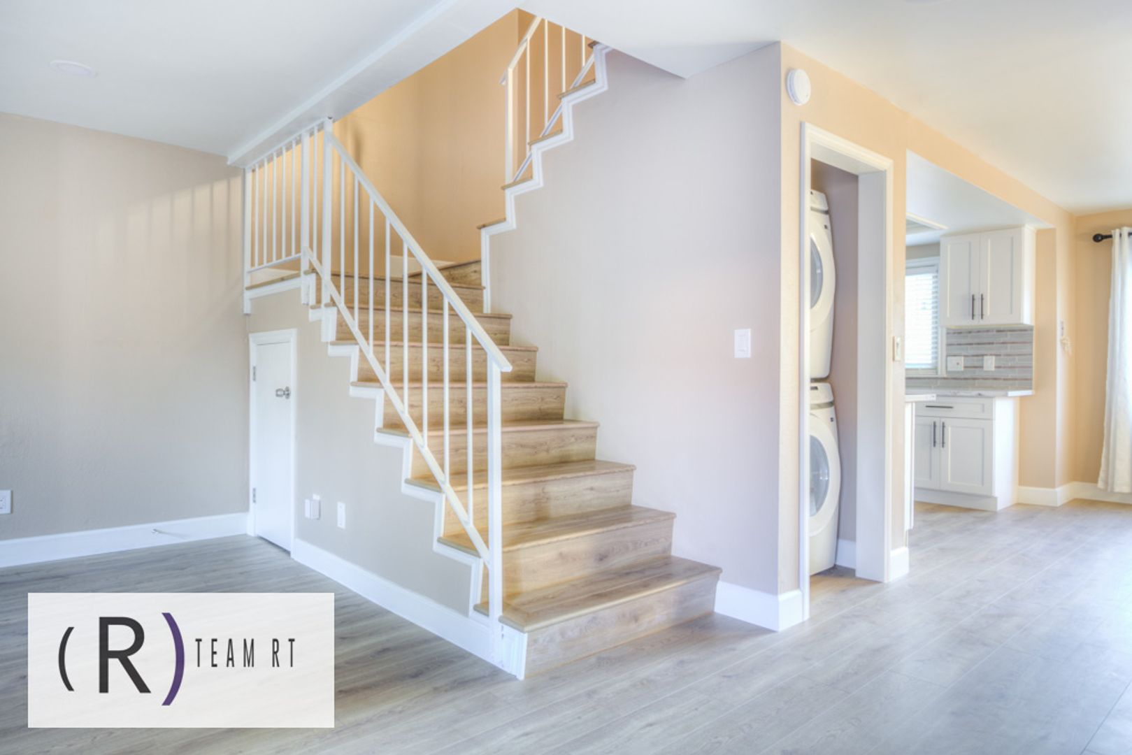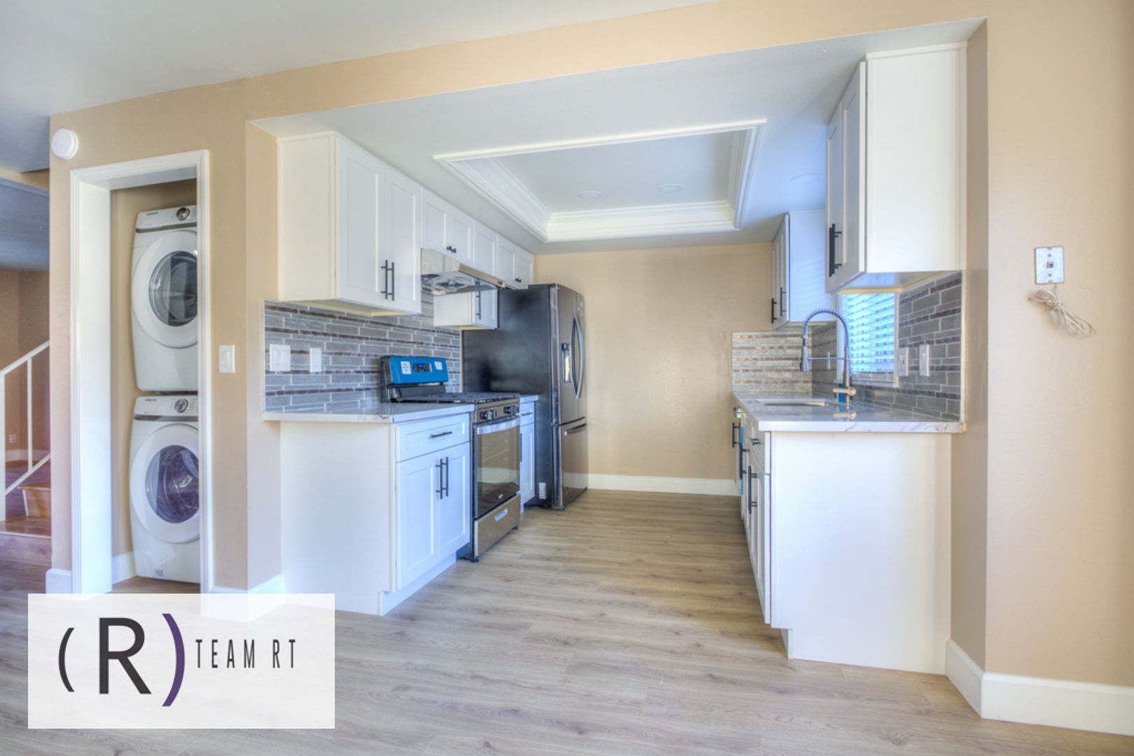You will find a spacious living area by the stairs. As you go around, there is another open space for the living area. Next to it, is a contemporary kitchen with all brand new stainless appliances, granite countertops, and ample cabinetry with plenty of space for storage and meal preparation.