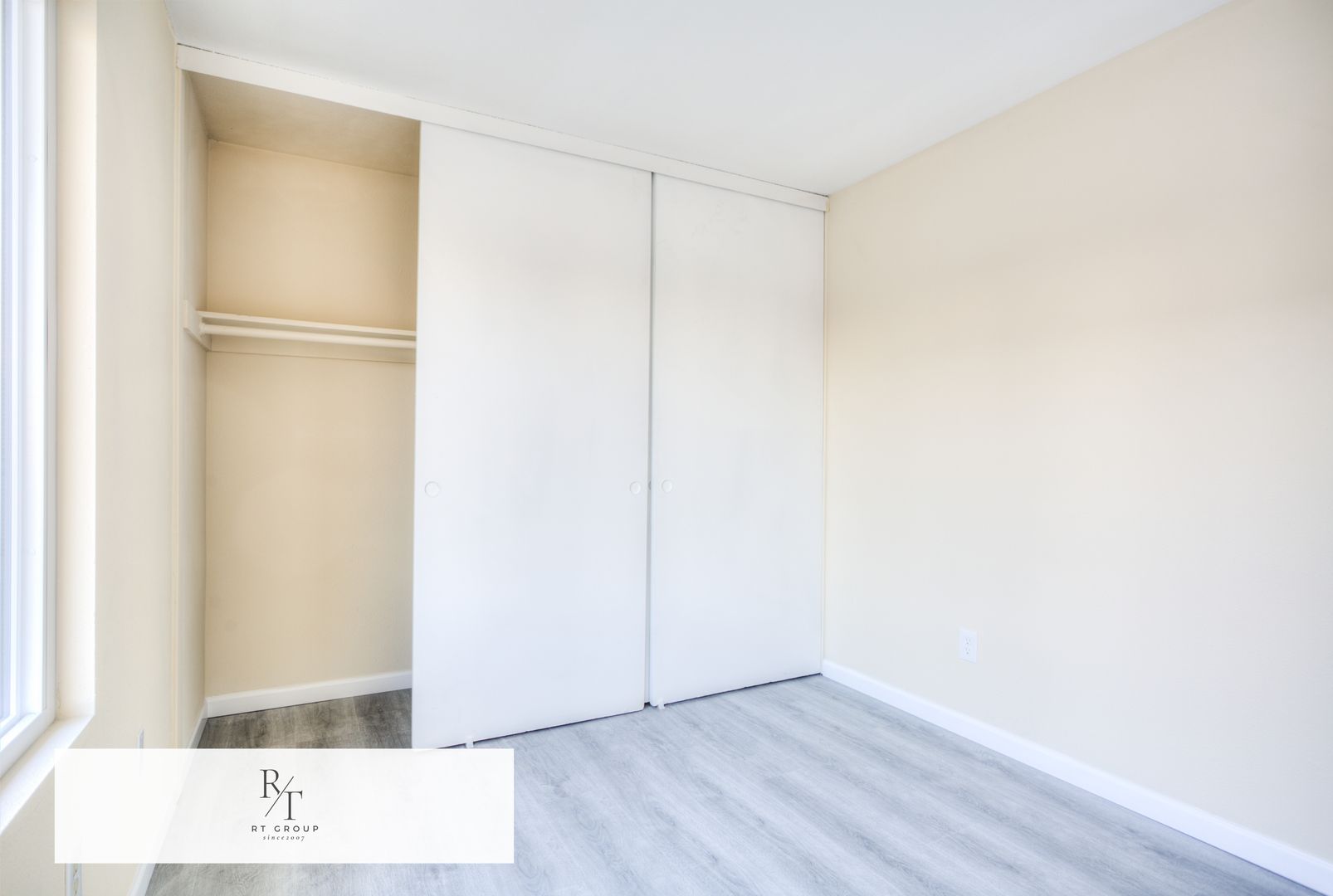 Upstairs, you will find 2 spacious bedrooms equipped with built-in cabinets, plush carpeted floors, and window AC units. Large glass windows flood the bedrooms with natural light, creating a bright and inviting atmosphere. There is also a modern-looking shared bathroom with a tub featuring classic design elements and tiled walls for a touch of luxury.