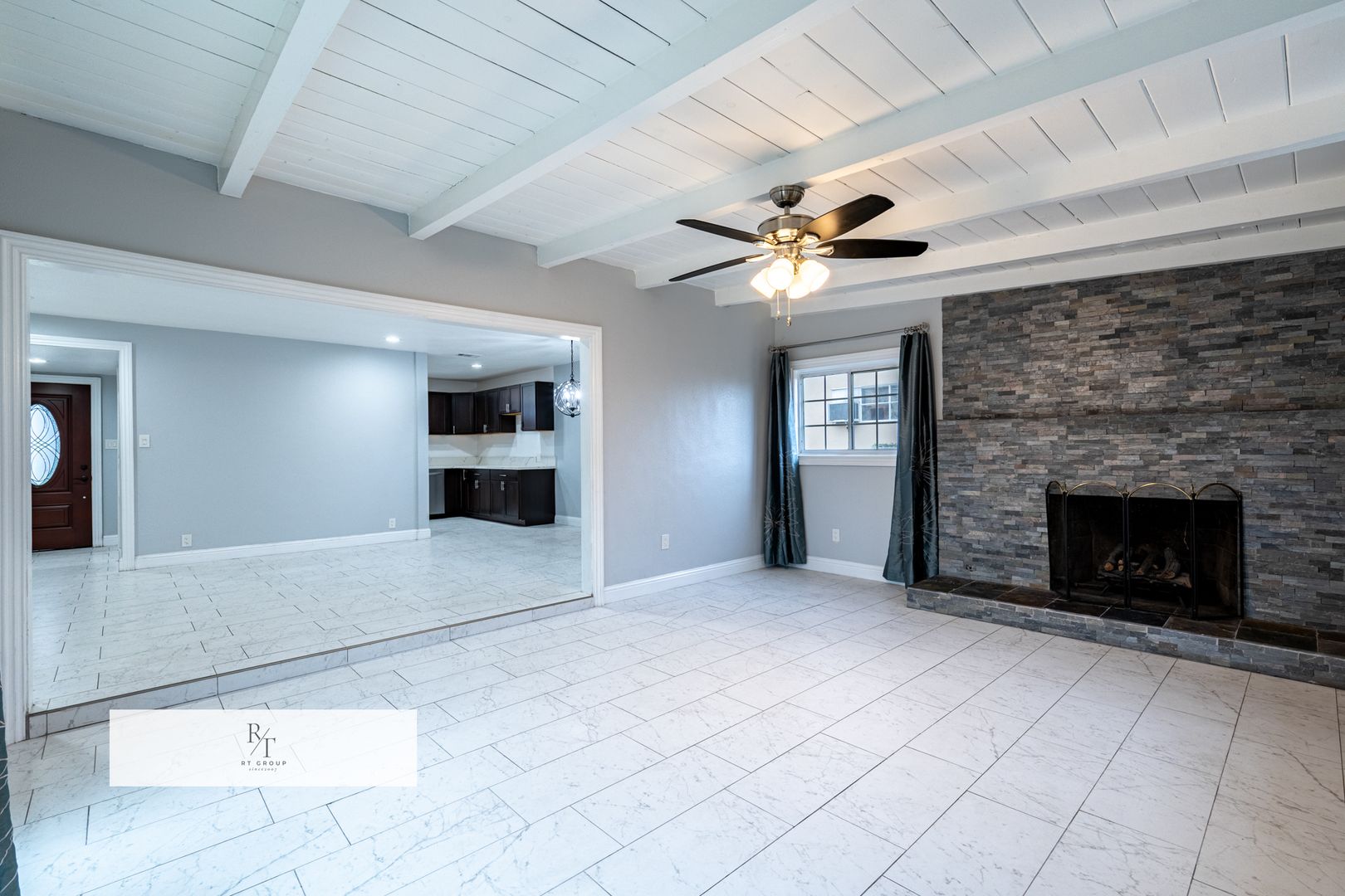 The bright and functional kitchen features well-designed cabinets, sleek countertops, a dishwasher and stove, and ample storage—perfect for both everyday living and entertaining. The open living room and dining area are spacious, airy, and seamlessly connected, creating a warm and welcoming atmosphere highlighted by dramatic exposed wood beam ceilings.